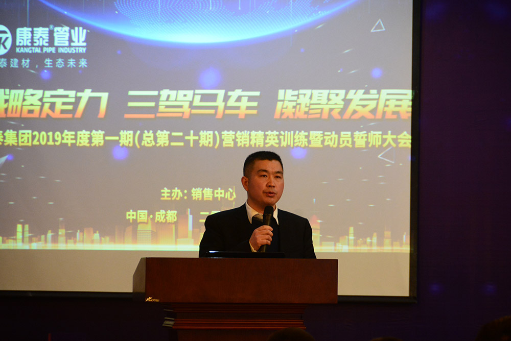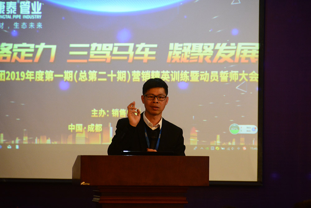 在全場熱烈的掌聲中,林總裁上臺作了熱情洋溢的新年致辭和動員講話。林總裁首先對集團公司在2018年取得的優(yōu)異業(yè)績向全體銷售人員的付出表示了感謝。林總裁表示,康泰的發(fā)展定位就是做中國工程集采第一供應商,2019年是充滿挑戰(zhàn)的一年,也是為實現(xiàn)三年目標打基礎的一年。我們要充分發(fā)揮三駕馬車——發(fā)展民建、發(fā)展網絡、發(fā)展市政的優(yōu)勢,切實做到品牌強大、技術強大、網絡強大、團隊強大,提升公司的核心競爭力。